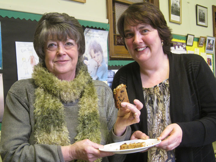 Delyth Davies, enillydd, a Dwysli Peleg-Williams, a osododd y dasg a gwneud y gacen
