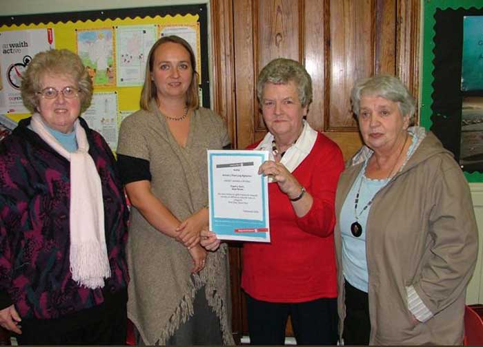 Kate Crockett yn cyflwyno tystysgrif Cymdeithas Achub y Plant